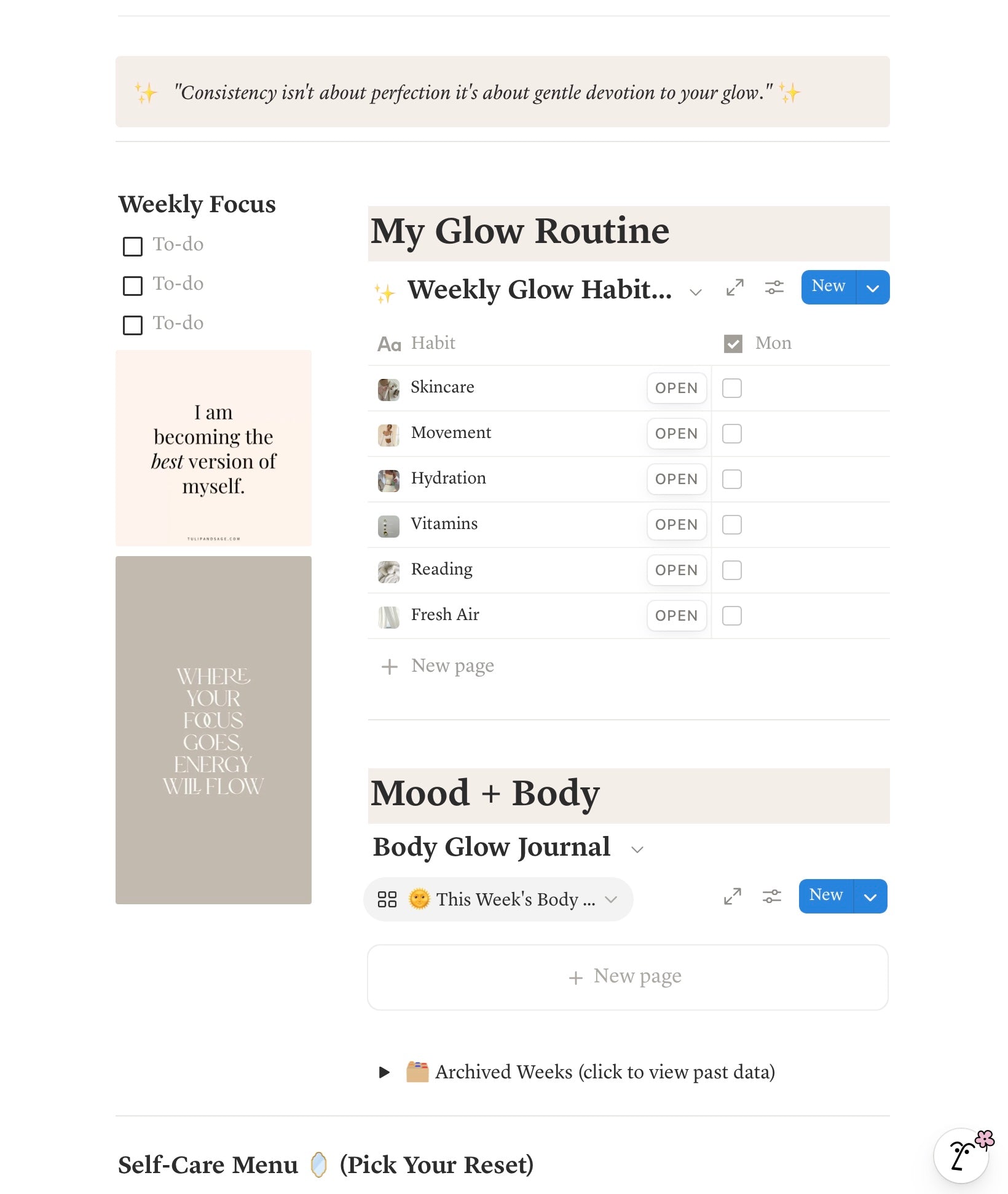 Designed to be pretty, intuitive, and motivating, this template helps you plan, track, and reflect without stress. Whether you want to build habits, manifest your goals, or just feel more organized and inspired, the Soft Girl Guide to Becoming Her gives you the tools to transform your routines, mindset, and life in 2026.